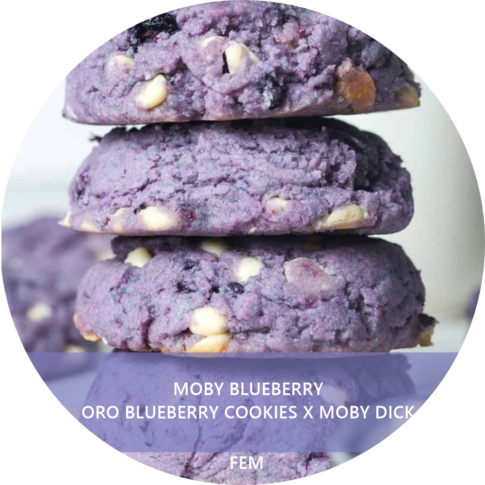 - Cruce principal: Moby Dick (Moby Dick suele ser un híbrido sativo-dominante proveniente de White Widow x Haze) x Blueberry (clásica indica-dominante de DJ Short).